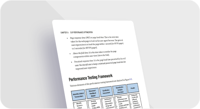 CHAPTeR 9 DXP PeRfORMANCe OPTIMIzATION • Page response time (PRT) or page load time: This is the total time taken for the web page to load on the user agent/browser. The general user expectation is to load the page within 1 second (for HTTP pages) to 5 seconds (for HTTPS pages). • Above the fold time: It is the time taken to render the page components within user view (above the fold). • Perceived response time: It is the page load time perceived by the end user. We should aim to keep a minimal perceived page load time for improved user experience. Performance Testing Framework Various elements of the performance testing framework are depicted in Figure 9-2. /ĚĞŶƚŝĨLJƌŝƚŝĐĂů ŽĐƵŵĞŶƚ YƵĂůŝƚĂƚŝǀĞ YƵĂŶƚŝƚĂƚŝǀĞ dƌĂŶƐĂĐƚŝŽŶƐ tŽƌŬůŽĂĚ ƐƐĞƐƐŵĞŶƚ ŶĂůLJƐŝƐ WƌĞĚŝĐƚ DŽĚĞů ;/ƚĞƌĂƚŝǀĞͿ /ĚĞŶƚŝĨLJ ĞǀĞůŽƉ ƌĐŚŝƚĞĐƚƵƌĞ džĞĐƵƚĞ ŶĂůLJnjĞƚŚĞ ďƵƐŝŶĞƐƐ ǁŽƌŬůŽĂĚ ƌĞǀŝĞǁĂŶĚ ƉĞƌĨŽƌŵĂŶĐĞƚĞƐƚ ƌĞƐƵůƚƐǁŝƚŚ ĐƌŝƚŝĐĂů ŵŽĚĞů ŽďƐĞƌǀĂƚŝŽŶƐ ŽůůĞĐƚĂŶĚĂŶĂůLJnjĞ ĚŝĨĨĞƌĞŶƚ ƚƌĂŶƐĂĐƚŝŽŶƐ ŶĂůLJnjĞE&ZƐ ĚĞƐŝŐŶĂŶĚ ƌĞƐƵůƚƐ ǁŽƌŬůŽĂĚƐ /ĚĞŶƚŝĨLJ ŶĂůLJnjĞ^>Ɛ ĐŽĚĞƌĞǀŝĞǁŽĨ ŽŵƉĂƌĞǁŝƚŚ^>Ɛ WƌĞĚŝĐƚƚŚĞ ƉĞƌĨŽƌŵĂŶĐĞ ƐĞůĞĐƚĞĚĨĞǁ /ĚĞŶƚŝĨLJŝƐƐƵĞƐ ƉĞƌĨŽƌŵĂŶĐĞ ĐƌŝƚŝĐĂů ƵƐĞĐĂƐĞƐ ;^ͬtĂŶĚ,ͬtͿ ŽŶƉƌŽĚƵĐƚŝŽŶ ƚƌĂŶƐĂĐƚŝŽŶƐ ZĞĐŽŵŵĞŶĚĂƚŝ ZĞĐŽŵŵĞŶĚ ĞŶǀŝƌŽŶŵĞŶƚƐ /ĚĞŶƚŝĨLJ ŽŶƐͬďĞƐƚ ƐŽůƵƚŝŽŶƐ ƐŝŐŶŝĨŝĐĂŶƚƵƐĞ ƉƌĂĐƚŝĐĞƐ dĞĂŵƐƚŽĨŝdžŝƐƐƵĞƐ ĐĂƐĞƐ ZĞǀŝĞǁ ƉĞƌĨŽƌŵĂŶĐĞ ƚĞƐƚƉůĂŶ Figure 9-2. Key elements of performance testing framework Various elements of the performance testing framework are elaborated as follows. 244