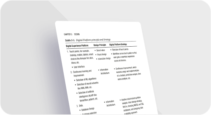 Chapter 3 Design Table 3-1. Digital Platform principle and Strategy Digital Experience Platform Design Principle Digital Platform Strategy 1. t ouch points, for example, • Brand value • selection of touch points. desktop, mobile, tablets, smart • Visual design • Workflow across touch points so that devices like amazon fire stick, • interaction design user gets a seamless experience alexa, etc. across all devices. • User interface 2. Continuous learning and • information • Continuous improvement, which improvement architecture includes usage and implementation • selection of ML algorithms of a chatbot, prediction analysis, time • selection of neural networks series analysis, etc. like rnn, ann, etc. • selection of artificial intelligence (ai) api like tensorflow, pytorch, etc. 3. Data. • information • intuitive data includes pattern • Database Design architecture analysis, data storage strategy, • Database selection that is, choosing nosQL and sQL databases, and designing data scalability approach. 4. integration • interaction design • api ecosystem includes strategy • api gateway to choose microservices approach • esB approach or monolithic services approach, • Microservices or monolithic choosing esB and gateways for api approach integration. • infrastructure • information • Fast delivery infrastructure, which architecture includes platform security scalability and deployment approach. Digital platform strategy, as provided in Table 3-1 helps one to build their own DXP for their organization. Let’s look into mapping of these principles to DXP strategy and design as shown in Figure 3-3. 66