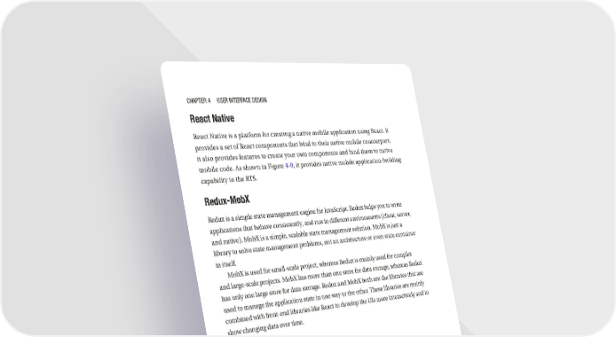 Chapter 4 User InterfaCe DesIgn React Native React Native is a platform for creating a native mobile application using React. It provides a set of React components that bind to their native mobile counterpart; it also provides features to create your own components and bind them to native mobile code. As shown in Figure 4-9, it provides native mobile application-building capability to the RTS. Redux-MobX Redux is a simple state management engine for JavaScript. Redux helps you to write applications that behave consistently, and run in different environments (client, server, and native). MobX is a simple, scalable state management solution. MobX is just a library to solve state management problems, not an architecture or even state container in itself. MobX is used for small-scale project, whereas Redux is mainly used for complex and large-scale projects. MobX has more than one store for data storage, whereas Redux has only one large store for data storage. Redux and MobX both are the libraries that are used to manage the application state in one way or the other. These libraries are mainly combined with front-end libraries like React to develop the UIs more interactively and to show changing data over time. Flux Flux is the application architecture that Facebook uses for building client-side web applications; it’s a pattern rather than a formal framework. It is a kind of architecture that complements React and the concept of unidirectional data flow. It is the data layer in JavaScript applications and building client-side web applications. React takes care of V or the view part in MVC, whereas Flux is a programming pattern that takes care of the M in MVC. Jest Jest is used by Facebook to test all JavaScript code including React applications. As shown in Figure 4-9, it provides testing capability to the RTS. 138
