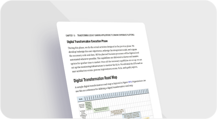 Chapter 10 transforming LegaCy Banking appLiCations to Banking experienCe pLatforms Digital Transformation Execution Phase During this phase, we do the actual activities designed in the previous phase. We develop/redesign the user experience, redesign the integration model, and migrate the necessary code and data. All the planned business processes will be digitized and automated wherever possible. The capabilities are delivered in shorter and iterative sprints for quicker time to market. Once all the necessary capabilities are set up, we can set up the monitoring infrastructure to monitor the SLAs. We will track the KPIs such as user satisfaction scores, process improvement scores, SLAs, and quality reports. Digital Transformation Road Map A sample digital transformation road map is depicted in Figure 10-8. Organizations can use this as a reference for defining a digital transformation road map. ϭ Ϯ ϯ ϰ ϱ ϲ ϳ ϴ ϵ Ϭ ϭ Ϯ ϯ ϰ ϱ ϲ ϳ ϴ ϵ Ϭ ϭ ϭ Ϯ ϯ ϰ ϱ ϲ ϳ ϴ ϵ Ϭ ϭ Ϯ ϯ tĞĞŬƐ ĞĞŬ ϭ ϭ ϭ ϭ ϭ ϭ ϭ ϭ ϭ ϭ Ϯ Ϯ Ϯ Ϯ Ϯ Ϯ Ϯ Ϯ Ϯ Ϯ Ϯ ϯ ϯ ϯ ϯ t ĞĞŬ ĞĞŬ ĞĞŬ ĞĞŬ ĞĞŬ ĞĞŬ ĞĞŬ ĞĞŬ ĞĞŬ ĞĞŬ ĞĞŬ ĞĞŬ ĞĞŬ ĞĞŬ ĞĞŬ ĞĞŬ ĞĞŬ ĞĞŬ ĞĞŬ ĞĞŬ ĞĞŬ ĞĞŬ ĞĞŬ ĞĞŬ ĞĞŬ ĞĞŬ ĞĞŬ ĞĞŬ ĞĞŬ ĞĞŬ ĞĞŬ ĞĞŬ ĞĞŬ t t t t t t t t t t t t t t t t t t t t t t t t t t t t t t t t t ůƵĞWƌŝŶƚŝŶŐ͕ ZĞƋƵŝƌĞŵĞŶƚ ZĞƋƵŝƌĞŵĞŶƚ ŐĂƚŚĞƌŝŶŐ͕&ŝƚ ůĂďŽƌĂƚŝŽŶ 'ĂƉĂŶĂůLJƐŝƐ͘ ^ŽůƵƚŝŽŶďůƵĞ ƉƌŝŶƚŝŶŐ͘ DsWZĞůĞĂƐĞ DŽďŝůĞĞŶĂďůĞŵĞŶƚ͕ZĞƐƉŽŶƐŝǀĞh/͕ ϭ͘Ϭ͗hƐĞƌ ĂƐŚďŽĂƌĚĞdžƉĞƌŝĞŶĐĞ͕>ĞĂŶh/ džƉĞƌŝĞŶĐĞ DsWZĞůĞĂƐĞϮ͘Ϭ >ŝŐŚƚǁĞŝŐŚƚZ^dƐĞƌǀŝĐĞƐ͕DŝĐƌŽ /ŶƚĞŐƌĂƚŝŽŶ ƐĞƌǀŝĐĞƐ͕W/'ĂƚĞǁĂLJƵƐĂŐĞ͕dǁŽ ZĞĚĞƐŝŐŶ ^ƉĞĞĚŝŐŝƚĂůƐĞƌǀŝĐĞƐ ŽŶƚĞŶƚ>ŝĨĞĐLJĐůĞŵĂŶĂŐĞŵĞŶƚ͕,ĞĂĚůĞƐƐD^͕^ŝƚĞ DsWZĞůĞĂƐĞϯ͘Ϭ ^ĞĂƌĐŚ͕ŽŶƚĞŶƚ^ĞĂƌĐŚ͕ŽŶƚĞŶƚƵƚŚŽƌŝŶŐ͕ ŽŶƚĞŶƚΘ ŽŶƚĞŶƚĞĚŝƚŝŶŐ͕ŽŶƚĞŶƚƉƵďůŝƐŚŝŶŐ͕ŽŶƚĞŶƚ ^ĞĂƌĐŚ ƚĂŐŐŝŶŐ͕,ĞĂĚůĞƐƐD^͕dĂdžŽŶŽŵLJ͕DĞƚĂĚĂƚĂ DsWZĞůĞĂƐĞϰ͘Ϭ ŵĂŶĂŐĞŵĞŶƚ ^ŽĐŝĂůΘ &ŽƌƵŵƐ͕tŝŬŝ͕DĞƐƐĞŶŐĞƌ͕ŚĂƚďŽƚ͕<ŶŽǁůĞĚŐĞďĂƐĞ͕ ŽůůĂďŽƌĂƚŝŽŶ ĂůĞŶĚĂƌ͕^ƵƌǀĞLJ͕WŽůůƐ͕ŵĂŝů͕ZĞǀŝĞǁΘZĂƚŝŶŐ DsWZĞůĞĂƐĞϱ͘Ϭ WĞW ƌƐŽŶĂůŝnjůŝ ĂƚƚŝŽŝ Ŷ͕ŽŵŵĞƌĐĞ͕ŝŐŝ ŝƚŝƚĂůůDDĂƌŬĞŬ ƚŝƚŝŶŐ͕tŽt ƌŬĨůŽǁΘ KƚŚĞƌŝŐŝƚĂů KƌĐŚĞƐƚƌĂƚŝŽŶ͕tĞďŶĂůLJƚŝĐƐ͕ƌƚŝĨŝĐŝĂů/ŶƚĞůůŝŐĞŶĐĞΘ ĂƉĂďŝůŝƚŝĞƐ DĂĐŚŝŶĞůĞĂƌŶŝŶŐ͕ŝŐĂƚĂ ƵƚŚĞŶƚŝĐĂƚŝŽŶ͕ZŽůĞďĂƐĞĚĂĐĐĞƐƐ͕WĞƌŵŝƐƐŝŽŶDŽĚĞů͕ŶƚŝƚůĞŵĞŶƚƐ͕&ĞĚĞƌĂƚĞĚ^^K͕ ^ĞĐƵƌŝƚLJ ^ŝŶŐůĞ^ŝŐŶŽŶ;^^KͿ͕^ĞĐƵƌŝƚLJƚĞƐƚŝŶŐ /ŶĨƌĂƐƚƌƵĐƚƵƌĞΘ ůŽƵĚĞƉůŽLJŵĞŶƚ͕,ŝŐŚĂǀĂŝůĂďŝůŝƚLJ͕DŽŶŝƚŽƌŝŶŐƐĞƚƵƉ͕^ŽƵƌĐĞĐŽŶƚƌŽů͕ƵƚŽŵĂƚĞĚƌĞůĞĂƐĞŵĂŶĂŐĞŵĞŶƚ͕ŽŶƚŝŶƵŽƵƐŝŶƚĞŐƌĂƚŝŽŶ͕ ĞǀKWƐ ŽŶƚŝŶƵŽƵƐƚĞƐƚŝŶŐ͕ƵƚŽŵĂƚĞĚĚĞƉůŽLJŵĞŶƚ͕ƵƚŽŵĂƚĞĚĐŽĚĞYƵĂůŝƚLJ͕WƌŽũĞĐƚŵĂŶĂŐĞŵĞŶƚ͕ŽŶƚŝŶƵŽƵƐ/ŵƉƌŽǀĞŵĞŶƚ Figure 10-8. Digital transformation road map Reimagining the Digital Banking Experience This section defines all the tools, methods, and processes needed for redefining the banking experience. 288