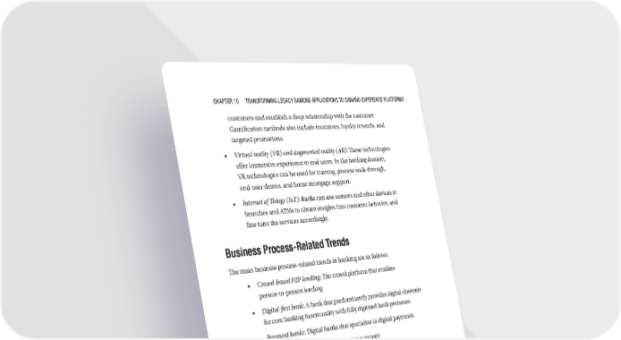 Chapter 10 transforming LegaCy Banking appLiCations to Banking experienCe pLatforms customers and establish a deep relationship with the customer. Gamification methods also include incentives, loyalty rewards, and targeted promotions. • Virtual reality (VR) and augmented reality (AR): These technologies offer immersive experience to end users. In the banking domain, VR technologies can be used for training, process walk-through, end- user demos, and home mortgage support. • Internet of Things (IoT): Banks can use sensors and other devices at branches and ATMs to obtain insights into customer behavior, and fine tune the services accordingly. Business Process-Related Trends The main business process-related trends in banking are as follows: • Crowd-based P2P lending: The crowd platform that enables person- to- person lending • Digital-first bank: A bank that predominantly provides digital channels for core banking functionality with fully digitized bank processes • Payment banks: Digital banks that specialize in digital payments • Digital wallets: Systems for managing e-money • Social media banking: Banking through social media channels (such as Facebook) and messaging channels (such as WhatsApp) Digital Transformation of Traditional Banks to Digital Banks This section looks at various options for the digital transformation of traditional banks to modern DXPs. Reference Technology Architecture for a Digital Bank A reference technology architecture of a digital bank is depicted in Figure 10-3. 269