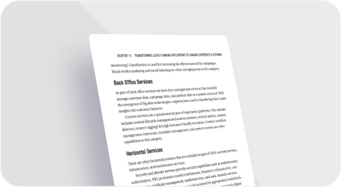 Chapter 10 transforming LegaCy Banking appLiCations to Banking experienCe pLatforms monitoring). Gamification is used for increasing the effectiveness of the campaigns. Social media marketing and social listening are other emerging areas in this category. Back Office Services As part of back office services we have data management services that centrally manage customer data, campaign data, and product data in a system of record. With the emergence of big data technologies, organizations need to handle big data to gain insights into customer behavior. Content services are a quintessential part of experience platforms. This module includes content lifecycle management (content creation, content update, content deletion, content tagging) through business-friendly interfaces. Content workflow management, taxonomy, metadata management, and content version are other capabilities in this category. Horizontal Services There are other horizontal services that are included as part of DXPs: security services, infrastructure, and maintenance services. Security and identity services provide security capabilities such as authentication, authorization, SSO, permission model/entitlements, biometric authentication, user provisioning, certificate management, credential store, and such. Security services ensure that the experience platform is securely accessed by appropriately individuals. Delivery support involves methods for optimal program management of a digital solution. Modern digital solutions use agile methods to quickly deliver the capabilities to the market. Automation and continuous integration tools are used in release management for agile delivery. Infrastructure and maintenance services are used in deployment and maintenance of the digital solution. Various capabilities in this module are cloud deployment support, clustering, high-availability support, scalability support, SLA management methods, monitoring infrastructure, and such. Reference Functional View of Digital Bank A reference functional architecture of a digital bank is depicted in Figure 10-4. We can use the technical components depicted in Figure 10-3 to realize the functionality. 273