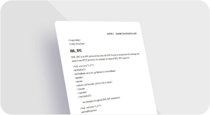 Chapter 5 Designing the integration Layer XML_RPC XML_RPC is an RPC protocol that uses the XML format to encapsulate the message and send it over HTTP protocol. An example of a typical XML-RPC request is: account.getBalance Sourabh_Sethi An example of a typical XML-RPC response is: 2000 USD JSON-RPC It is an RPC encoded in JSON format, as shown in the following example. It is a simple and lightweight protocol, and the DXP can consume data in any format but expose and interact in this protocol with other applications. An example of a typical JSON-RPC request would be: { "account": "ABCBANK1234", } 159