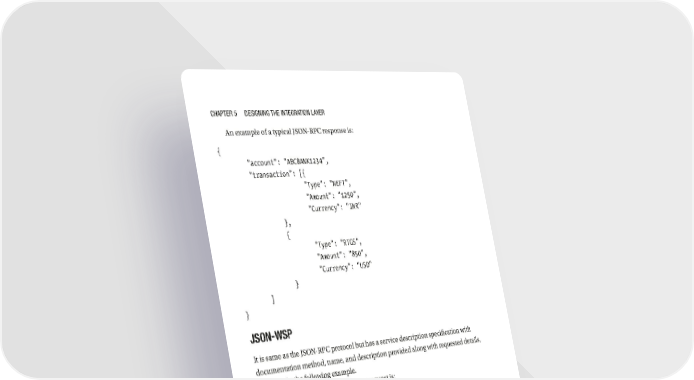 Chapter 5 Designing the integration Layer An example of a typical JSON-RPC response is: { "account": "ABCBANK1234", "transaction": [{ "Type": "NEFT", "Amount": "1250", "Currency": "INR" }, { "Type": "RTGS", "Amount": "850", "Currency": "USD" } ] } JSON-WSP It is same as the JSON-RPC protocol but has a service description specification with documentation method, name, and description provided along with requested details, as shown in the following example. An example of a typical JSON-WSP request is: { "type": "jsonwsp/request", "version": "1.0", "methodname": "getTransactions", "args": { "account": "Sourabh_Sethi } } 160