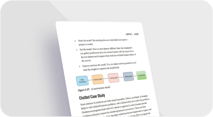 Chapter 3 Design • Train the model: The training data set is identified and used to prepare a model. • Test the model: This is a new dataset, different than the training set; you gather predictions from the trained model with the inputs from the test dataset and compare them with the withheld output values of the test set. • Improve and tune the model: You can adjust various parameters and tune the weights to improve the model built. Figure 3-27. AI automation model Chatbot Case Study Most common AI solutions are built using Tensorflow, Python, and Spark. AI strategy helps to solve defined business problems, with a defined data set to solve the problems. Chatbots are programs built with NLP, which is supposed to solve domain-specific problems and query request by simulating human conversation. There are three components: presentation layer; bot layer, which has the bot framework or engine; and transaction and data processing system, which interact with the DXP to integrate the existing system with the chatbot engine, as shown in Figure 3-28. • Presentation layer: The chat interface can be a custom UI (e.g., Angular, React) and native mobile application. You can interact with this layer using text, voice, and visual. Inputs are sent to the backend layer using web socket communication and REST APIs. • Bot engine: This is an open-source bot framework used to create the bot model for specific use cases and domains to understand the intent of the user. The bot framework has capabilities to process, understand, and generate language that is NLP, NLU, and NLG as follows. • NLP (natural language processing): This component understands the text or voice and understands the intent of the user. 107