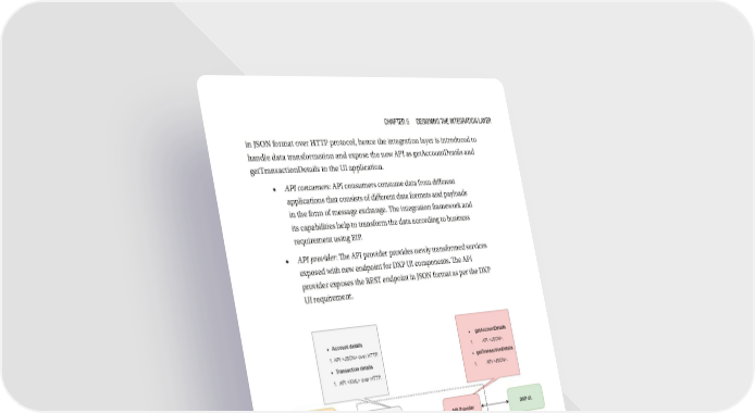 Chapter 5 Designing the integration Layer in JSON format over HTTP protocol, hence the integration layer is introduced to handle data transformation and expose the new API as getAccountDeatils and getTransactionDetails to the UI application. • API consumers: API consumers consume data from different applications that consists of different data formats and payloads in the form of message exchange. The integration framework and its capabilities help to transform the data according to business requirement using EIP. • API provider: The API provider provides newly transformed services exposed with new endpoint for DXP UI components. The API provider exposes the REST endpoint in JSON format as per the DXP UI requirement. Figure 5-7. Data transformation 177
