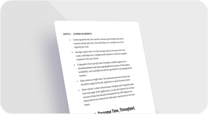 Chapter 2 GatherinG requirements • Content growth rate: You need to estimate percentage increase in content volume per year; that will help you to analyze your load capacity per year. • Average session time: It is the average amount of session time for a user, and helps you to analyze and estimate in-memory support required in the near future. • Geographic (Geo)-specific load: Globally available applications should distribute load across geographical locations. Performance, availability, and scalability should be specified for each geographical location. • Peak volume or traffic time: The maximum amount of users that should be supported by the application at peak business hours. • Data volume: As data volume keeps changing and it depends upon load and usage of the application, you should estimate the average amount of data that should be handled by the DXP application, which will let you estimate the disk space requirement in the near future. Performance–Response Time, Throughput, Utilization, Static Volumetric It is essential to check your industry standards for measuring application performance. Results should be collected from real browsers, which will assist you in checking the page load time on different browsers and operating systems. Gain insight into the performance requirements and testing approaches. Before beginning with load testing, you need to determine page response time applicable to the business process and whether response time is justifiable and achievable. Performance Requirements You need to consider and build workload profiles for the user stories as mentioned in Table 2-9, and associated workload profile related to use case mentioned in Table 2-10. 46