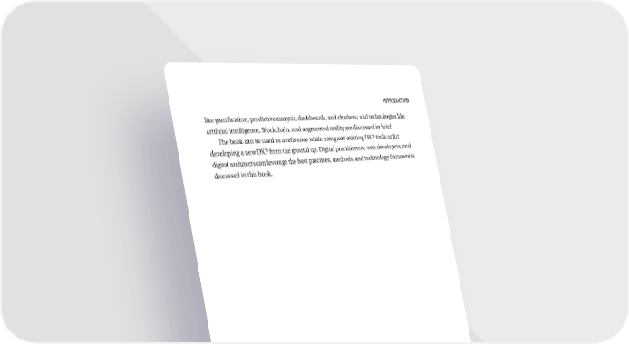 InTroduCTIon like gamification, predictive analysis, dashboards, and chatbots; and technologies like artificial intelligence, Blockchain, and augmented reality are discussed in brief. The book can be used as a reference while using any existing DXP tools or for developing a new DXP from the ground up. Digital practitioners, web developers, and digital architects can leverage the best practices, methods, and technology frameworks discussed in this book. xxv