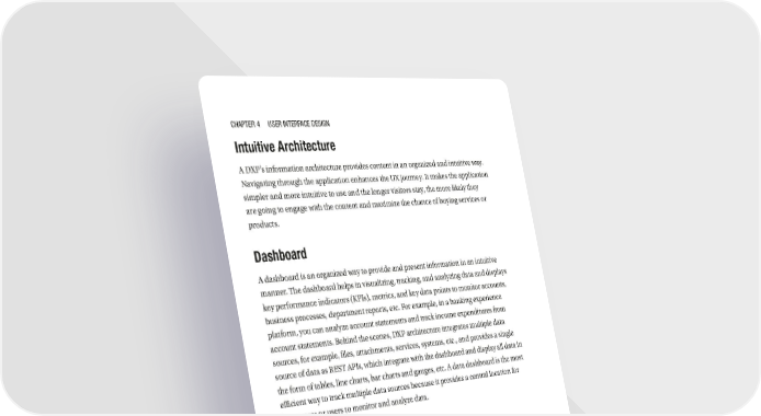 Chapter 4 User InterfaCe DesIgn Intuitive Architecture A DXP’s information architecture provides content in an organized and intuitive way. Navigating through the application enhances the UX journey. It makes the application simpler and more intuitive to use and the longer visitors stay, the more likely they are going to engage with the content and maximize the chance of buying services or products. Dashboard A dashboard is an organized way to provide and present information in an intuitive manner. The dashboard helps in visualizing, tracking, and analyzing data and displays key performance indicators (KPIs), metrics, and key data points to monitor accounts, business processes, department reports, etc. For example, in a banking experience platform, you can analyze account statements and track income expenditures from account statements. Behind the scenes, DXP architecture integrates multiple data sources, for example, files, attachments, services, systems, etc., and provides a single source of data as REST APIs, which integrate with the dashboard and display all data in the form of tables, line charts, bar charts and gauges, etc. A data dashboard is the most efficient way to track multiple data sources because it provides a central location for businesses or users to monitor and analyze data. Responsive Interface Grid system layout of a DXP handles the responsiveness of the application, on desktop, mobile, as well as tablets. DXPs work on a mobile-first approach to implement responsive features. The mobile-first approach is the best strategy in the market to make adaptive designs. In the mobile-first approach, content or information is prioritized and sorted into primary, secondary, and tertiary content, for example, the home page should have a company logo and links to products or services. As everything wouldn’t fit into a smart phone screen, the DXP provides the ability to prioritize the content as per business requirements. In Figure 4-1, the desktop screen has six UI components: components 1 and 2 are primary content, component 3 is secondary content, and components 4, 5 and 6 are tertiary content. As the resolution of the screen changes, these components start getting wrapped as per the priority of the content, as shown in Figure 4-2. Components 4, 5 and 6 where horizontally aligned, but the mobile view is wrapped up and these components are vertically aligned. 120