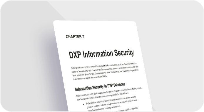 CHAPTER 7 DXP Information Security Information security is crucial for digital platforms that are used for financial domains such as banking. In this chapter we discuss various aspects of information security. The best practices given in this chapter can be used for defining and implementing a robust information security framework for DXPs. Information Security in DXP Solutions Information security defines policies for protecting data at rest and data during transit. The basic principles of information security are defined as follows: • Information security policies: Organizations should define security policies and procedures and processes to protect information from unauthorized access and appropriate use. • Data access policy definition: Access policies should be defined for data, based on the sensitive nature of the data. • Defense in depth: Provide layer-wise access policies at each of the application tiers. • Compartmentalization: Group the information and provide access to grouped information (called “compartments”) only on a need-to- know basis. Compartmentalization reduces the attack surface and can be implemented using layer-wise security and the least privilege principle. • Least privilege by default: Provide only the minimal needed privileges for entities and processes. • Centralized access: All security policies such as authentication and authorization should be centrally controlled. © Shailesh Kumar Shivakumar, Sourabhh Sethii 2019 201 S. K. Shivakumar and S. Sethii, Building Digital Experience Platforms, https://doi.org/10.1007/978-1-4842-4303-9_7