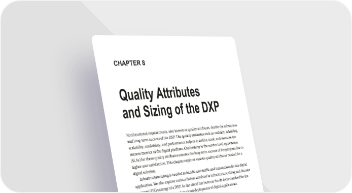 CHAPTER 8 Quality Attributes and Sizing of the DXP Nonfunctional requirements, also known as quality attributes, decide the robustness and long-term success of the DXP. The quality attributes such as usability, reliability, scalability, availability, and performance help us to define, track, and measure the success metrics of the digital platform. Conforming to the service level agreements (SLAs) for these quality attributes ensures the long-term success of the program due to higher user satisfaction. This chapter explores various quality attributes needed for a digital solution. Infrastructure sizing is needed to handle user traffic and transactions for the digital application. We also explore various factors involved in infrastructure sizing and disaster recovery (DR) strategy of a DXP. As the cloud has become the de facto standard for the digital application, we will explore cloud deployment of digital applications. Key Quality Attributes of DXP The key quality attributes of DXP are explained in the following list. Each of these quality attributes has its own set of metrics and SLA to quantitatively measure the quality attribute. • Scalability: The ability of the DXP to scale to increased user traffic, data, and transaction volume without compromising the overall performance • Availability: The overall percentage of the time DXP is available and functioning normally over a specific time period (usually 1 year) © Shailesh Kumar Shivakumar, Sourabhh Sethii 2019 215 S. K. Shivakumar and S. Sethii, Building Digital Experience Platforms, https://doi.org/10.1007/978-1-4842-4303-9_8