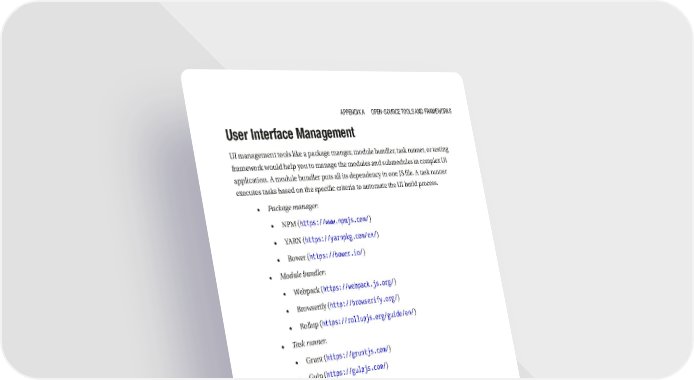 Appendix A Open-SOurce TOOlS And FrAmewOrkS User Interface Management UI management tools like a package manger, module bundler, task runner, or testing framework would help you to manage the modules and submodules in complex UI application. A module bundler puts all its dependency in one JS file. A task runner executes tasks based on the specific criteria to automate the UI build process. • Package manager: • NPM (https://www.npmjs.com/) • YARN (https://yarnpkg.com/en/) • Bower (https://bower.io/) • Module bundler: • Webpack (https://webpack.js.org/) • Browserify (http://browserify.org/) • Rollup (https://rollupjs.org/guide/en/) • Task runner: • Grunt (https://gruntjs.com/) • Gulp (https://gulpjs.com/) • Testing: • Mocha (https://mochajs.org/) • Jest (https://jestjs.io/) • Jasmine (https://jasmine.github.io/) • Cucumber (https://cucumber.io/) • Karma (https://karma-runner.github.io/latest/index.html) A DXP uses a package manager and module bundler to integrate and manage the dependency package used while developing UI components, and uses a task runner to build tasks to minify and watch the changes while developing UI components. A DXP uses previously mentioned open-source testing frameworks for test-driven development and behavior-driven development. 323