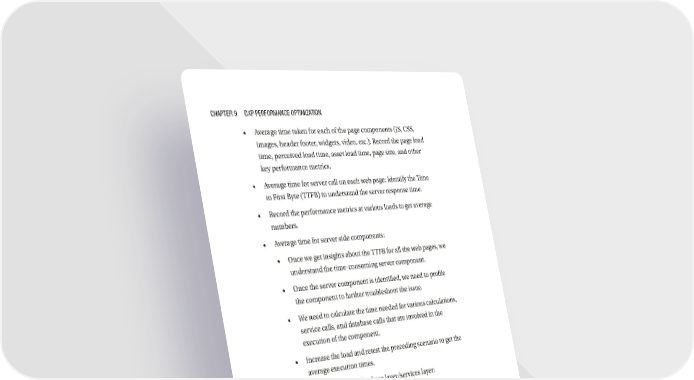 CHAPTeR 9 DXP PeRfORMANCe OPTIMIzATION • Average time taken for each of the page components (JS, CSS, images, header footer, widgets, video, etc.): Record the page load time, perceived load time, asset load time, page size, and other key performance metrics. • Average time for server call on each web page: Identify the Time to First Byte (TTFB) to understand the server response time. • Record the performance metrics at various loads to get average numbers. • Average time for server side components: • Once we get insights about the TTFB for all the web pages, we understand the time-consuming server component. • Once the server component is identified, we need to profile the component to further troubleshoot the issue. • We need to calculate the time needed for various calculations, service calls, and database calls that are involved in the execution of the component. • Increase the load and retest the preceding scenario to get the average execution times. • Average time spent at database layer/services layer: • Based on the profiling of the server-side component, if the performance issue is traced to the database layer or services layer, identify the problem-causing query or service call. • Execute the time-consuming query and identify the performance optimizations needed for the query (using an explain plan and other database-related optimizations such as indexes, query caching, etc.) • Identify the performance optimizations for the service call (such as using server-side caching, optimal sizing, fine tuning server configurations, etc.). • Increase the load and retest the scenario to get average times. 248