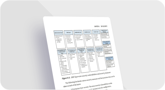 Chapter 6 DXp SeCurity Robust Security Infrastructure Layer Web Layer Application Layer Database Layer Services Layer Planning •Denial of service •Information •Injection attacks • Data integrity •Information Security assessment •Security Disclosure •Direct object •Weak password disclosure configuration • Elevation of reference •Elevated privilege • Absence of Threat profiling •Elevation of privilege and •Insecure entropy for database security privilege Cross-site users enforcement scripting (XSS) Static and Runtime Testing Black box and white box testing Security Measures Security Measures Security Measures Security Measures Security Measures at Infrastructure at Web Layer at Application at Database Layer at Services Layer Security code scanning Layer Layer • Firewalls •Least privilege •Input validation • Data integrity •Message level Vulnerability • Monitoring access • Auditing and • Data backup and security penetration testing •Secure transport • Custom error logging recovery •Secure layer pages •Fine grained procedures transmission layer •Network traffic authorization • Data audits Continuous Security analysis • Data encryption • Data recovery Testing •Robust • Error handling processes authentication • Escaping and Early and continuous, •Robust server encoding special iterative testing configuration characters •Server hardening Continuous security •Virus scanners monitoring •Intrusion detection Figure 6-2. DXP layer-wise security vulnerabilities and security measures The following list details various security measures and best practices that can be taken at each of the layers: • Infrastructure layer security: The main security vulnerabilities at this layer are denial of service attack, incorrect security configuration, and elevation of privilege. In order to address the security vulnerabilities, the appropriate security measures include firewalls, robust monitoring, and usage of SSL (Secure Sockets Layer)/TLS (Transport Layer Security), providing robust server configuration, server hardening (disabling of all unnecessary ports, services, and protocols at the server machines), and installing virus scanners and intrusion detection systems. • Web server layer security: The main vulnerabilities at this layer are accidental information disclosure in the stacktraces and error messages, and elevation of privilege. In order to address this, we need to use custom messages that hide the system and framework details. Enforce a least privilege policy for all resources to prevent accidental information leakage, minimizing the risk of escalation of privileges. 185
