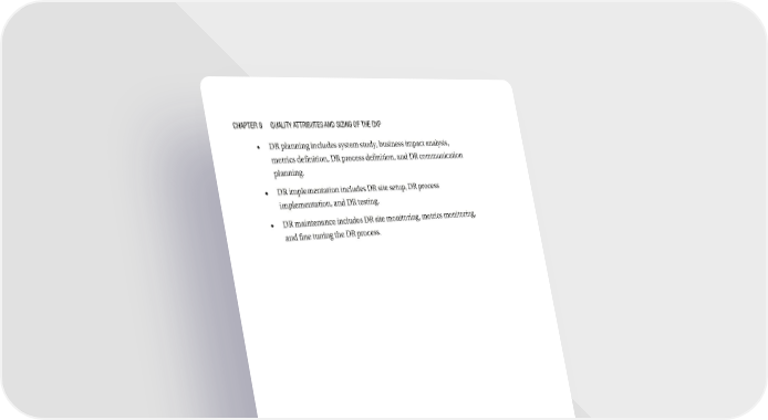Chapter 8 Quality attributes and sizing of the dXp • DR planning includes system study, business impact analysis, metrics definition, DR process definition, and DR communication planning. • DR implementation includes DR site setup, DR process implementation, and DR testing. • DR maintenance includes DR site monitoring, metrics monitoring, and fine tuning the DR process. 234