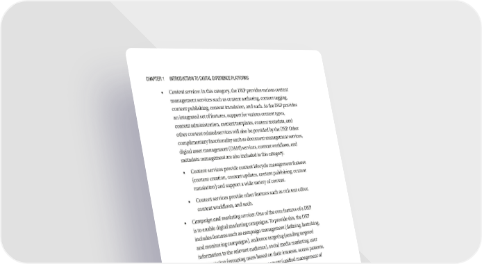 Chapter 1 IntroduCtIon to dIgItal experIenCe platforms • Content services: In this category, the DXP provides various content management services such as content authoring, content tagging, content publishing, content translation, and such. As the DXP provides an integrated set of features, support for various content types, content administration, content templates, content metadata, and other content related services will also be provided by the DXP. Other complimentary functionality such as document management services, digital asset management (DAM) services, content workflows, and metadata management are also included in this category. • Content services provide content lifecycle management features (content creation, content updates, content publishing, content translation) and support a wide variety of content. • Content services provide other features such as rich text editor, content workflows, and such. • Campaign and marketing services: One of the core features of a DXP is to enable digital marketing campaigns. To provide this, the DXP includes features such as campaign management (defining, launching, and monitoring campaigns), audience targeting (sending targeted information to the relevant audience), social media marketing, user segmentation (grouping users based on their interests, access patterns, and such), and customer data management (unified management of customer data across all customer touch points). A DXP provides campaign management features (campaign creation, campaign targeting) and user segmentation (categorizing end users based on demographics, interests and such) in this category. Customer data management (profile data, preferences data, transaction data, and navigation data) is used for understanding customers and provides targeted content. Customer data is used to provide a single view of customer data (activities, preferences, transactions, feed, etc.) in the dashboard. Other marketing functionality such as social media marketing is included as well. • Campaign and marketing services mainly deliver targeted content based on user attributes, preferences, analytics, and such. 8