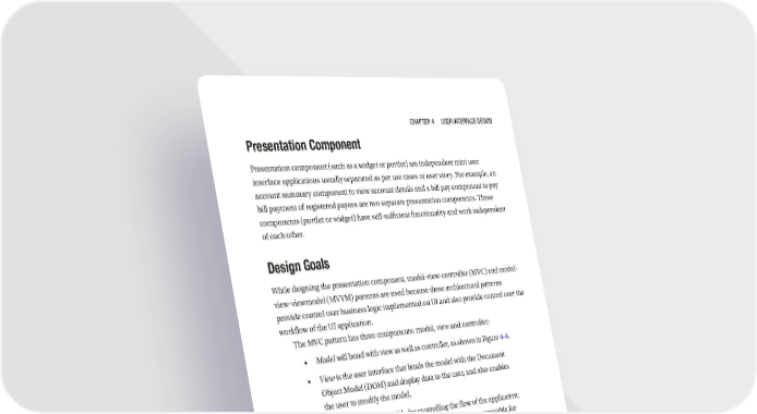 Chapter 4 User InterfaCe DesIgn Presentation Component Presentation component (such as a widget or portlet) are independent mini user interface applications usually separated as per use cases or user story. For example, an account summary component to view account details and a bill pay component to pay bill payment of registered payees are two separate presentation components. These components (portlet or widget) have self-sufficient functionality and work independent of each other. Design Goals While deigning the presentation component, model-view-controller (MVC) and model- view- viewmodel (MVVM) patterns are used because these architectural patterns provide control over business logic implemented on UI and also provide control over the workflow of the UI application. The MVC pattern has three components: model, view and controller: • Model will bond with view as well as controller, as shown in Figure 4- 4. • View is the user interface that binds the model with the Document Object Model (DOM) and display data to the user, and also enables the user to modify the model. • Controllers are responsible for controlling the flow of the application; if you make a web services request, the controller is responsible for providing a response back to the application. MVC and MVVM patterns provide the following features to your application and help to achieve goals like upgradable, extendable, lean, and testable: • Upgradable and extendable presentation components. This can be achieved through API and object-oriented features of the framework. As shown in Figure 4-4, the UI component can extend to the base component; hence, if upgrading the framework, your functionality will not be impacted in the UI component. You can implement common functionality in the base components and other UI components can use it simply by extending the base components. 125