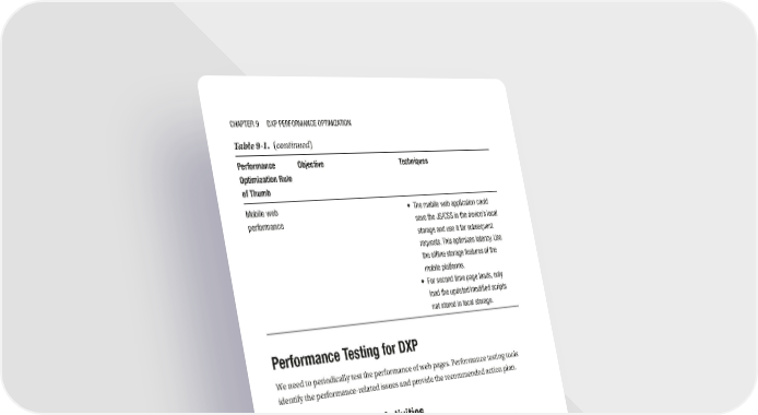CHAPTeR 9 DXP PeRfORMANCe OPTIMIzATION Table 9-1. (continued) Performance Objective Techniques Optimization Rule of Thumb Mobile web • The mobile web application could performance save the JS/CSS in the device’s local storage and use it for subsequent requests. This optimizes latency. Use the offline storage features of the mobile platforms. • for second time page loads, only load the updated/modified scripts not stored in local storage. Performance Testing for DXP We need to periodically test the performance of web pages. Performance testing tools identify the performance-related issues and provide the recommended action plan. Performance Testing Activities Key performance testing values for a regular sprint-based delivery are depicted in Figure 9-1. 238