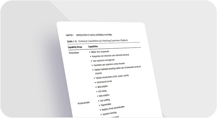 Chapter 1 IntroduCtIon to dIgItal experIenCe platforms Table 1-5. Technical Capabilities of a Banking Experience Platform Capability Group Capabilities presentation • mobile-first components • responsive and interactive user interaction elements • user experience management • Consistent user experience across channels • Intuitive dashboard providing unified view of transactions across all channels • Intuitive visualizations (charts, graphs, reports) • omnichannel access • Web analytics • a/B testing • Web analytics personalization • user profiling • segmentation • analytics-driven personalization • targeted marketing security • Identity management • single sign-on (sso) • encryption • adaptive security • multifactor authentication • fraud detection • flexible authentication methods • data security (continued) 22