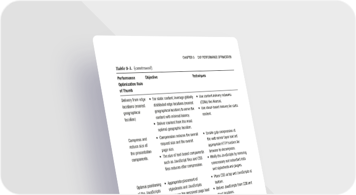 CHAPTeR 9 DXP PeRfORMANCe OPTIMIzATION Table 9-1. (continued) Performance Objective Techniques Optimization Rule of Thumb Delivery from edge • for static content, leverage globally • Use content delivery networks locations (nearest distributed edge locations (nearest (CDNs) like Akamai. geographical geographical location) to serve the • Use cloud-based delivery for static location) content with minimal latency. content. • Deliver content from the most optimal geographic location. Compress and • Compression reduces the overall • enable gzip compression at reduce size of request size and the overall the web server layer and set the presentation page size. appropriate HTTP headers for components. • The size of text-based components browser to decompress. such as JavaScript files and CSS • Minify the JavaScripts by removing files reduces after compression. unnecessary and redundant data and stylesheets and plugins. Optimal positioning • Appropriate placement of • Place CSS at top and JavaScripts at of the JavaScripts stylesheets and JavaScripts bottom. and stylesheets improves the perceived page load • Deliver JavaScripts from CDN and times and prevents browsers cloud locations. getting blocked. Other performance • Avoid server redirects. optimization rules • Use custom build of JS frameworks of thumb to include only the needed modules/components. • Remove duplicate HTTP calls. • fix all 404 errors and avoid 301 redirects. • Use HTTP/2, which is the latest version of HTTP. • Use multiple domains to host and deliver static content. (continued) 237