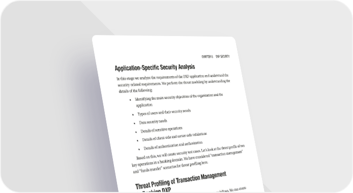 Chapter 6 DXp SeCurity Application-Specific Security Analysis In this stage we analyze the requirements of the DXP application and understand the security-related requirements. We perform the threat modeling by understanding the details of the following: • Identifying the main security objectives of the organization and the application • Types of users and their security needs • Data security needs • Details of sensitive operations • Details of client-side and server-side validations • Details of authentication and authorization Based on this, we will create security test cases. Let’s look at the threat profile of two key operations in a banking domain. We have considered “transaction management” and “funds transfer” scenarios for threat profiling here. Threat Profiling of Transaction Management in Banking DXP The main vulnerabilities in transaction management are as follows. We can create security test cases for testing these scenarios: • Using SQL injection attacks to tamper the transaction details (account number, account holder name, timestamp) and attempt to view/update/delete the transaction details of other users • Adding dummy or duplicate or incomplete or inaccurate transactions • Attempting to steal transaction details of other users through man- in- middle or CSRF attacks 195