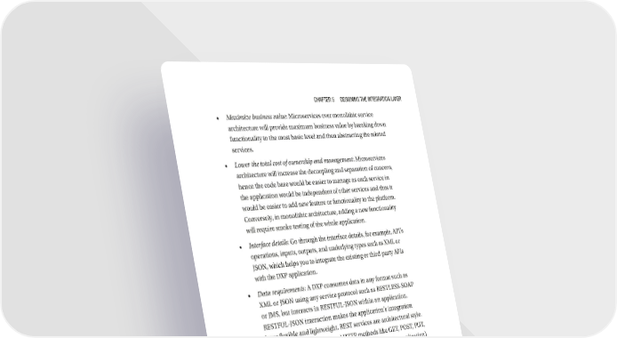 Chapter 5 Designing the integration Layer • Maximize business value: Microservices over monolithic service architecture will provide maximum business value by breaking down functionality to the most basic level and then abstracting the related services. • Lower the total cost of ownership and management: Microservices architecture will increase the decoupling and separation of concern, hence the code base would be easier to manage as each service in the application would be independent of other services and thus it would be easier to add new feature or functionality to the platform. Conversely, in monolithic architecture, adding a new functionality will require smoke testing of the whole application. • Interface details: Go through the interface details, for example, API’s operations, inputs, outputs, and underlying types such as XML or JSON, which helps you to integrate the existing or third-party APIs with the DXP application. • Data requirements: A DXP consumes data in any format such as XML or JSON using any service protocol such as RESTLESS-SOAP or JMS, but interacts in RESTFUL-JSON within an application. RESTFUL-JSON interaction makes the application’s integration layer flexible and lightweight. REST services are architectural style. REST uses HTTP protocol and HTTP methods like GET, POST, PUT, and DELETE to communicate between client (Angular application) and server (integration) application; whereas, as SOAP is a message exchange style between client and server, SOAP services are Remote Procedural Call (RPC) architecture style, which would have service metadata (i.e., contracts) to communicate between client and server. • Restless: These services work with resources as well as its operations such as PUT, POST, DELETE etc. You need to identify the services and operations attached to REST Service, for example, operations such as SaveTransation(), GetTransaction(), DeleteTransaction(), UpdateTransaction() on transaction services. A service contract has to be shared with the client; the client will use these details to call the services. 151