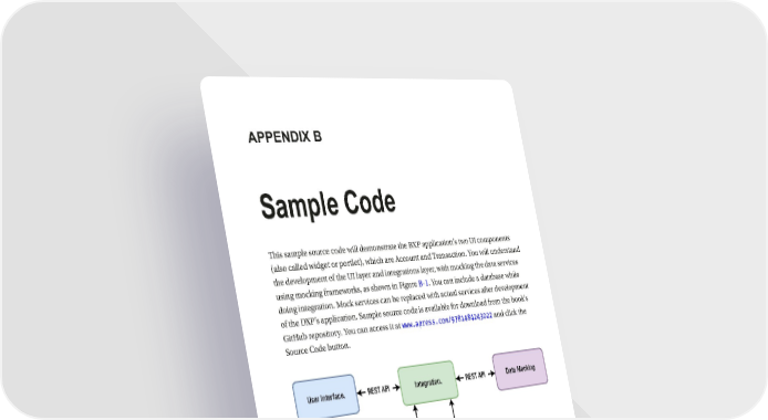 APPENDIX B Sample Code This sample source code will demonstrate the BXP application’s two UI components (also called widget or portlet), which are Account and Transaction. You will understand the development of the UI layer and integrations layer, with mocking the data services using mocking frameworks, as shown in Figure B-1. You can include a database while doing integration. Mock services can be replaced with actual services after development of the DXP’s application. Sample source code is available for download from the book’s GitHub repository. You can access it at www.apress.com/9781484243022 and click the Source Code button. User Interface. REST API Integration. REST API Data Mocking SQL No-SQL Database Database Database Figure B-1. Developing UI and Integration © Shailesh Kumar Shivakumar, Sourabhh Sethii 2019 333 S. K. Shivakumar and S. Sethii, Building Digital Experience Platforms, https://doi.org/10.1007/978-1-4842-4303-9