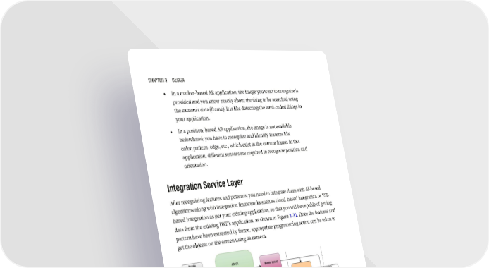 Chapter 3 Design • In a marker-based AR application, the image you want to recognize is provided and you know exactly about the thing to be searched using the camera’s data (frame). It is like detecting the hard-coded things in your application. • In a position-based AR application, the image is not available beforehand; you have to recognize and identify features like color, pattern, edge, etc., which exist in the camera frame. In this application, different sensors are required to recognize position and orientation. Integration Service Layer After recognizing features and patterns, you need to integrate them with AI-based algorithms along with integration frameworks such as cloud-based integration or ESB- based integration as per your existing application, so that you will be capable of getting data from the existing DXP’s application, as shown in Figure 3-31. Once the features and pattern have been extracted by frame, appropriate programming action can be taken to get the objects on the screen using its camera. Figure 3-31. Augmented reality integration 112