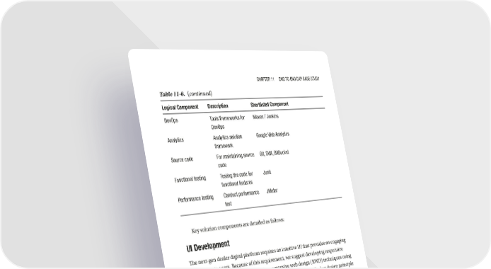 Chapter 11 end to end dXp Case study Table 11-6. (continued) Logical Component Description Shortlisted Component devops tools/frameworks for Maven / Jenkins devops analytics analytics solution Google Web analytics framework source code For maintaining source Git, sVn, BitBucket code Functional testing testing the code for Junit functional features performance testing Conduct performance JMeter test Key solution components are detailed as follows: UI Development The next-gen dealer digital platform requires an intuitive UI that provides an engaging experience to users. Because of this requirement, we suggest developing responsive single-page application (SPA) following responsive web design (RWD) techniques using HTML5, Angular, Bootstrap, CSS, and Angular Material Design. The key design principle is to separate data from representation. SPA invokes APIs to get the required content and renders so that it is responsive. Features like internationalization/localization are implemented using frameworks like i18Next. Domain Specific Microservices As the platform will be transformed over time, it is important to keep delivering business value continuously. We can leverage microservices to be decomposed based on domains and subdomains. This will allow business functions to be independently developed and perhaps even coexist with other legacy functions before they are transformed. 317