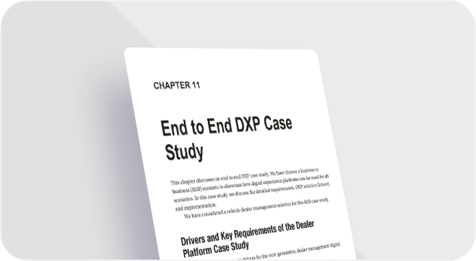 CHAPTER 11 End to End DXP Case Study This chapter discusses an end to end DXP case study. We have chosen a business to business (B2B) scenario to showcase how digital experience platforms can be used for all scenarios. In this case study, we discuss the detailed requirements, DXP solution fitment, and implementation. We have considered a vehicle dealer management solution for this B2B case study. Drivers and Key Requirements of the Dealer Platform Case Study Given as follows are the main drivers for the next-generation dealer management digital platform: Next-generation user experience that engages customers and reduces complexity: • The digital platform should provide a consistent, omnichannel and personalized user experience across all touchpoints. • The digital platform should provide self-service tools for dealers, sales executives, and support personnel. • The user experience should be accessible on any device anytime. • Identify and improve customer engagement KPIs. • Provide collaboration across dealers, customer, sales, and marketing team. © Shailesh Kumar Shivakumar, Sourabhh Sethii 2019 299 S. K. Shivakumar and S. Sethii, Building Digital Experience Platforms, https://doi.org/10.1007/978-1-4842-4303-9_11