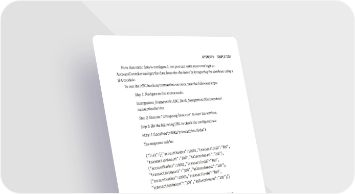 Appendix B SAmple Code Note that static data is configured, but you can write your own logic in AccountContoller and get the data from the database by integrating the database using a JPA module. To run the ABC banking transaction services, take the following steps: Step 1: Navigate to the source code. Intergartion_Framework\ABC_Bank_Integration\Microservices\ transactionService Step 2: Execute “mvnspring-boot:run” to start the services. Step 3: Hit the following URL to check the configurations: http://localhost:8082/transaction/findall The response will be: {"list":[{"accountNumber":10001,"transactionId":"800", "transactionAmount":"300","balanceAmount":"200"}, {"accountNumber":10002,"transactionId":"800", "transactionAmount":"300","balanceAmount":"200"}, {"accountNumber":10003,"transactionId":"800", "transactionAmount":"300","balanceAmount":"200"}]} Note the following: • Static data is configured, but you can write you own logic in TransactionController and get the data from the database by integrating the database using JPA module. • You can replace microservices with Apache Camel services by integrating the endpoints in an Angular application. • You can open these microservices projects in Intellij IDEA IDE. • You can access the Eureka Server URL and can check the services and instance registered with Eureka Server as shown in Figure B-20. 361