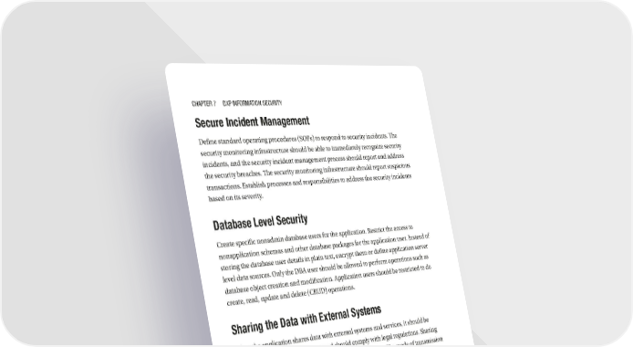 Chapter 7 DXp InformatIon SeCurIty Secure Incident Management Define standard operating procedures (SOPs) to respond to security incidents. The security monitoring infrastructure should be able to immediately recognize security incidents, and the security incident management process should report and address the security breaches. The security monitoring infrastructure should report suspicious transactions. Establish processes and responsibilities to address the security incidents based on its severity. Database Level Security Create specific nonadmin database users for the application. Restrict the access to nonapplication schemas and other database packages for the application user. Instead of storing the database user details in plain text, encrypt them or define application server level data sources. Only the DBA user should be allowed to perform operations such as database object creation and modification. Application users should be restricted to do create, read, update and delete (CRUD) operations. Sharing the Data with External Systems When the application shares data with external systems and services, it should be strictly based on agreed contracts and should comply with legal regulations. Sharing of private data needs consent from the information owners. The mode of transmission and information loss responsibility should be agreed upon by all parties during the information exchange. The confidentiality, integrity, and availability of the data should be maintained during information exchange. Security Awareness and Training All the stakeholders of the organization should be aware of the security processes and policies. In order to achieve that, the organization should conduct mandatory security awareness training for all the employees and they should be made aware of security best practices. In addition to training programs, employees who are handling secure information should undergo mandatory security certification. 210