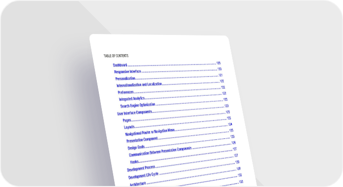 Table of ConTenTs Dashboard ��������������������������������������������������������������������������������������������������������������������������� 120 Responsive Interface ����������������������������������������������������������������������������������������������������������� 120 Personalization �������������������������������������������������������������������������������������������������������������������� 121 Internationalization and Localization ����������������������������������������������������������������������������������� 122 Preferences ������������������������������������������������������������������������������������������������������������������������� 122 Integrated Analytics ������������������������������������������������������������������������������������������������������������� 122 Search Engine Optimization ������������������������������������������������������������������������������������������������ 123 User Interface Components������������������������������������������������������������������������������������������������������� 123 Pages ����������������������������������������������������������������������������������������������������������������������������������� 123 Layouts �������������������������������������������������������������������������������������������������������������������������������� 123 Navigational Router or Navigation Menu ����������������������������������������������������������������������������� 124 Presentation Component ����������������������������������������������������������������������������������������������������� 125 Design Goals ������������������������������������������������������������������������������������������������������������������������ 125 Communication Between Presentation Components ���������������������������������������������������������� 126 Hooks ����������������������������������������������������������������������������������������������������������������������������������� 127 Development Process ��������������������������������������������������������������������������������������������������������������� 127 Development Life Cycle ������������������������������������������������������������������������������������������������������������ 129 Architecture ��������������������