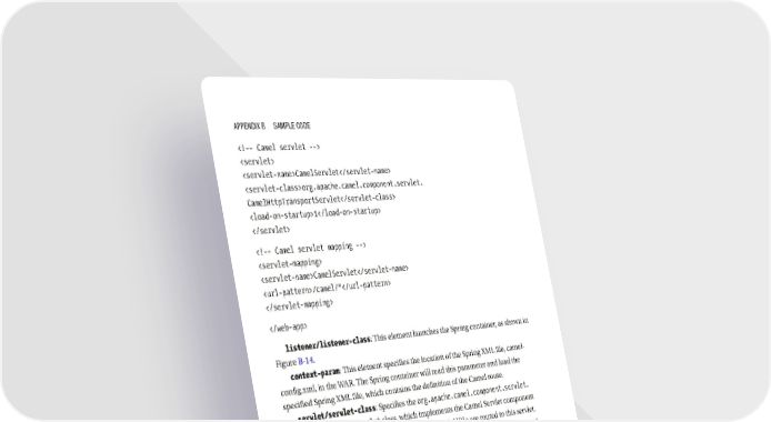 Appendix B SAmple Code CamelServlet org.apache.camel.component.servlet. CamelHttpTransportServlet 1 CamelServlet /camel/* listener/listener-class: This element launches the Spring container, as shown in Figure B-14. context-param: This element specifies the location of the Spring XML file, camel- config.xml, in the WAR. The Spring container will read this parameter and load the specified Spring XML file, which contains the definition of the Camel route. servlet/servlet-class: Specifies the org.apache.camel.component.servlet. CamelHttpTransportServlet class, which implements the Camel Servlet component servlet-mapping/url-pattern. It determines which URLs are routed to this servlet. In general, the servlet URL has the following form: http://Host:Port/WARFileName/ URLPattern. Where the base URL, http://Host:Port, is determined by the configuration of the web server, the WARFileName is the root of the WARFileName.war WAR file, and the URLPattern is specified by the contents of the url-pattern element. Assuming that the application server port is set to 8001, the integration.0.0.1application would match URLs of the following form: http:// localhost:8001/integration.0.0.1/camel/*. The Camel route for this example, defined in a Spring XML file in applicationContext. xml, using Camel's XML DSL syntax, is shown in Listing B-2. 350