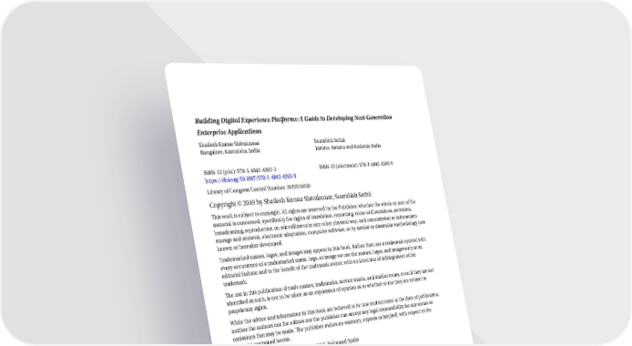 Building Digital Experience Platforms: A Guide to Developing Next-Generation Enterprise Applications Shailesh Kumar Shivakumar Sourabhh Sethii Bangalore, Karnataka, India Jammu, Jammu and Kashmir, India ISBN-13 (pbk): 978-1-4842-4302-2 ISBN-13 (electronic): 978-1-4842-4303-9 https://doi.org/10.1007/978-1-4842-4303-9 Library of Congress Control Number: 2019931830 Copyright © 2019 by Shailesh Kumar Shivakumar, Sourabhh Sethii This work is subject to copyright. All rights are reserved by the Publisher, whether the whole or part of the material is concerned, specifically the rights of translation, reprinting, reuse of illustrations, recitation, broadcasting, reproduction on microfilms or in any other physical way, and transmission or information storage and retrieval, electronic adaptation, computer software, or by similar or dissimilar methodology now known or hereafter developed. Trademarked names, logos, and images may appear in this book. Rather than use a trademark symbol with every occurrence of a trademarked name, logo, or image we use the names, logos, and images only in an editorial fashion and to the benefit of the trademark owner, with no intention of infringement of the trademark. The use in this publication of trade names, trademarks, service marks, and similar terms, even if they are not identified as such, is not to be taken as an expression of opinion as to whether or not they are subject to proprietary rights. While the advice and information in this book are believed to be true and accurate at the date of publication, neither the authors nor the editors nor the publisher can accept any legal responsibility for any errors or omissions that may be made. The publisher makes no warranty, express or implied, with respect to the material contained herein. Managing Director, Apress Media LLC: Welmoed Spahr Acquisitions Editor: Shiva Ramachandran Development Editor: Laura Berendson Coordinating Editor: Rita Fernando Cover designed by eStudioCalamar Cover image designed by Freepik (www.freepik.com) Distributed to the book trade worldwide by Springer Science+Business Media New York, 233 Spring Street, 6th Floor, New York, NY 10013. Phone 1-800-SPRINGER, fax (201) 348-4505, e-mail orders-ny@springer- sbm.com, or visit www.springeronline.com. Apress Media, LLC is a California LLC and the sole member (owner) is Springer Science + Business Media Finance Inc (SSBM Finance Inc). SSBM Finance Inc is a Delaware corporation. For information on translations, please e-mail [email protected], or visit www.apress.com/ rights-permissions. Apress titles may be purchased in bulk for academic, corporate, or promotional use. eBook versions and licenses are also available for most titles. For more information, reference our Print and eBook Bulk Sales web page at www.apress.com/bulk-sales. Any source code or other supplementary material referenced by the author in this book is available to readers on GitHub via the book’s product page, located at www.apress.com/9781484243022. For more detailed information, please visit www.apress.com/source-code. Printed on acid-free paper