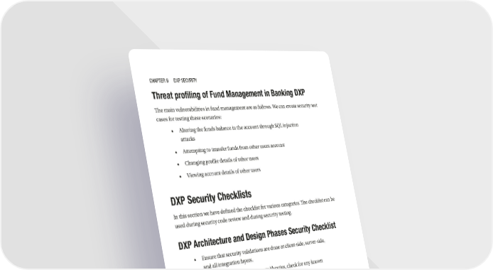 Chapter 6 DXp SeCurity Threat profiling of Fund Management in Banking DXP The main vulnerabilities in fund management are as follows. We can create security test cases for testing these scenarios: • Altering the funds balance in the account through SQL injection attacks • Attempting to transfer funds from other users account • Changing profile details of other users • Viewing account details of other users DXP Security Checklists In this section we have defined the checklist for various categories. The checklist can be used during security code review and during security testing. DXP Architecture and Design Phases Security Checklist • Ensure that security validations are done at client-side, server-side, and all integration layers. • While using the third-party party libraries, check for any known security vulnerabilities. • Identify all the sensitive data and categorize the data based on their sensitiveness. Clearly define the security policies for each of the categories. • Enforce continuous and iterative security testing at all SDLC lifecycle stages. • Define a robust cryptography process and encryption process. Prefer strong encryption algorithms such as SHA 256 bit for encryption and use one-way hash algorithms for encrypting sensitive data. • Establish a secure transport layer for all sensitive transactions. • Perform detailed thread profiling for the DXP application and define the security test cases for the same. 196