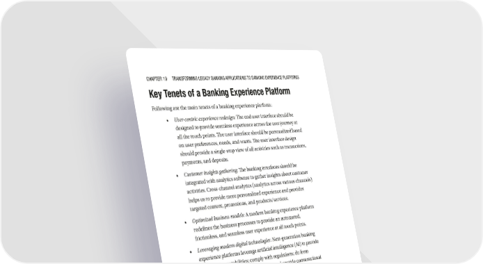 Chapter 10 transforming LegaCy Banking appLiCations to Banking experienCe pLatforms Key Tenets of a Banking Experience Platform Following are the main tenets of a banking experience platform: • User-centric experience redesign: The end user interface should be designed to provide seamless experience across the user journey at all the touch points. The user interface should be personalized based on user preferences, needs, and wants. The user interface design should provide a single-stop view of all activities such as transactions, payments, and deposits. • Customer insights gathering: The banking interfaces should be integrated with analytics software to gather insights about customer activities. Cross-channel analytics (analytics across various channels) helps us to provide more personalized experience and provides targeted content, promotions, and products/services. • Optimized business models: A modern banking experience platform redefines the business processes to provide an automated, frictionless, and seamless user experience at all touch points. • Leveraging modern digital technologies: Next-generation banking experience platforms leverage artificial intelligence (AI) to provide self-learning capabilities; comply with regulations; do form processing, search, and credit scoring; and provide conversational interfaces to provide superior user experience. AI technologies can be leveraged for portfolio planning, wealth planning, chatbots, virtual assistants, and such. Other digital technologies that are applicable in the banking domain are Blockchain (a sophisticated distributed ledger), IoT, big data, APIs, and the cloud. • Digital open ecosystem: Modern digital banks leverage APIs to aggregate all necessary services (such as payment, lending, social, etc.) to create an extensible banking platform. Using microservices and APIs, the next-generation banking platform should be able to aggregate information and integrate with partner systems to provide a frictionless experience. 262