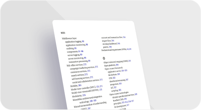 Index Middleware layer account and transaction flow, 345 application logging, 89 import flow, 344 application monitoring, 88 mockup dashboard, 345 auditing, 89 palette, 344 components, 87–88 Nonfunctional requirements (NFRs), 43, 245 server logging, 89 server monitoring, 88 O transaction processing, 89 Mid-office services, 272 Object relational mapping (ORM), 255 campaign/marketing services, 272 Open platform, 264 commerce services, 272 Open-source framework search services, 272 application server, 324–325 self-learning services, 272 blockchain, 329 social and collaboration services, 272 CSS, 322 Mobility, 265 distributed streaming, 327 Model-view-controller (MVC), 125, 271 integration, 324 Model-view-viewmodel (MVVM), 125 IoT, 327 Modularity, 216 scripting, 322 Monolithic architectural integration Open-source technologies technology, 168–169 domain specific microservices, 318 Mutual memorandum of understanding headless CMS, 318 (MOU), 167 principles, 313–314, 316–317 MVC pattern, 334 UI development, 317 Open-source tools N Apache Hadoop, 328 CD, 331 Natural language generation (NLG), 108 CI, 331 Natural language processing (NLP), 107 CMIS, 326 Natural language understanding CMS, 325 (NLU), 108 HTTP accelerator, 321 Next-gen communication, 265 NoSQL database, 326 Next-generation digital bank SCM, 331 attributes, 263–264 SQL database, 326 DXP features, 265–267 UI management, 323 Node package manager (NPM), 130, 137 web server, 321 Node-RED, 342–343 Optimized business models, 262 374