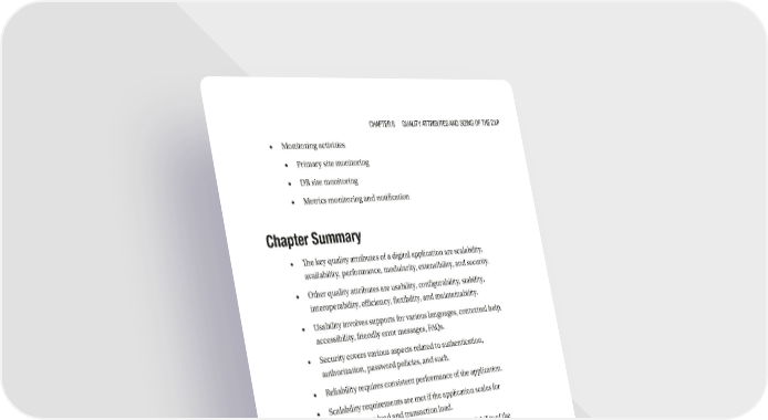 Chapter 8 Quality attributes and sizing of the dXp • Monitoring activities • Primary site monitoring • DR site monitoring • Metrics monitoring and notification Chapter Summary • The key quality attributes of a digital application are scalability, availability, performance, modularity, extensibility, and security. • Other quality attributes are usability, configurability, stability, interoperability, efficiency, flexibility, and maintainability. • Usability involves supports for various languages, contextual help, accessibility, friendly error messages, FAQs. • Security covers various aspects related to authentication, authorization, password policies, and such. • Reliability requires consistent performance of the application. • Scalability requirements are met if the application scales for increased user load and transaction load. • Availability requires continuous uptime and availability of the application. • Performance requirements cover application response time, process time, transaction completion time, and such. • Infrastructure sizing includes various factors such as load numbers, session numbers, content numbers, availability numbers, performance numbers, and throughput numbers. • A robust DR strategy includes DR planning, DR implementation, and DR maintenance. 233