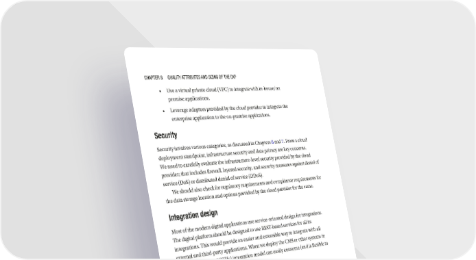 Chapter 8 Quality attributes and sizing of the dXp • Use a virtual private cloud (VPC) to integrate with in-house/on premise applications. • Leverage adaptors provided by the cloud provider to integrate the enterprise application to the on-premise applications. Security Security involves various categories, as discussed in Chapters 6 and 7. From a cloud deployment standpoint, infrastructure security and data privacy are key concerns. We need to carefully evaluate the infrastructure-level security provided by the cloud provider; that includes firewall, layered security, and security measures against denial of service (DoS) or distributed denial of service (DDoS). We should also check for regulatory requirements and compliance requirements for the data storage location and options provided by the cloud provider for the same. Integration design Most of the modern digital applications use service-oriented design for integrations. The digital platform should be designed to use REST-based services for all its integrations. This would provide an easier and extensible way to integrate with all external and third- party applications. When we deploy the CMS or other systems in headless mode, the RESTful integration model can easily consume (and is flexible to adapt to) this headless integration model. Cloud Deployment Model A typical cloud deployment model for a DXP application on the Amazon Cloud is shown in Figure 8-1. 226