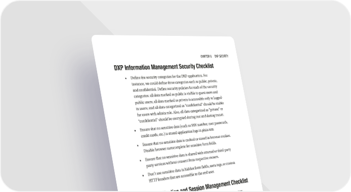 Chapter 6 DXp SeCurity DXP Information Management Security Checklist • Define the security categories for the DXP application. For instance, we could define three categories such as public, private, and confidential. Define security policies for each of the security categories: all data marked as public is visible to guest users and public users; all data marked as private is accessible only to logged- in users; and all data categorized as “confidential” should be visible for users with admin role. Also, all data categorized as “private” or “confidential” should be encrypted during rest and during transit. • Ensure that no sensitive data (such as SSN number, user passwords, credit cards, etc.) is stored application logs in plain text. • Ensure that no sensitive data is cached or stored in browser cookies. Disable browser autocomplete for sensitive form fields. • Ensure that no sensitive data is shared with external or third-party party services without consent from respective owners. • Don’t use sensitive data in hidden form fields, meta tags, or custom HTTP headers that are accessible to the end user. DXP Authentication and Session Management Checklist • Ensure that there is a centralized authentication management system that uses enterprise-wide LDAP or Active Directory. • Ensure that the centralized authentication system enforces robust password policies. Password policies include restriction on password strength, password change frequency, notification on password change events, account lockout policy, and such. • Define multi factor authentication (MFA) for sensitive functions such as admin functionality, password update functionality, and such. • Define strict session management policies including idle session timeout, avoiding multiple simultaneous sessions, creating random session IDs, and such. • The DXP application processes must run with minimum privilege. 197