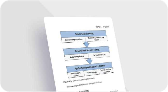 Chapter 6 DXp SeCurity Secure Code Scanning Secure Coding Guidelines Automated/Manual Code Review General Web Security Testing Vulnerability Testing Penetration Testing Application Specific Security Analysis Requirement Threat Analysis Security Test Case Analysis Preparation Figure 6-3. DXP security testing framework The main stages of DXP security testing are as follows: Secure Code Scanning In this stage the development team uses secure coding guidelines and standards to develop the DXP application. Security guidelines and coding standards and white box security tools are used in this stage. Automated security code scanners and manual code reviews can be used to check for any known security issues. The common security issues that can be uncovered through security code review are listed as follows: • Usage of password in plain text format in code or in configuration file or in database • Use of the user inputs directly for SQL queries or LDAP queries, leading to injection attacks • Absence of user input validation, cookie values, URL parameters, and form field values 193
