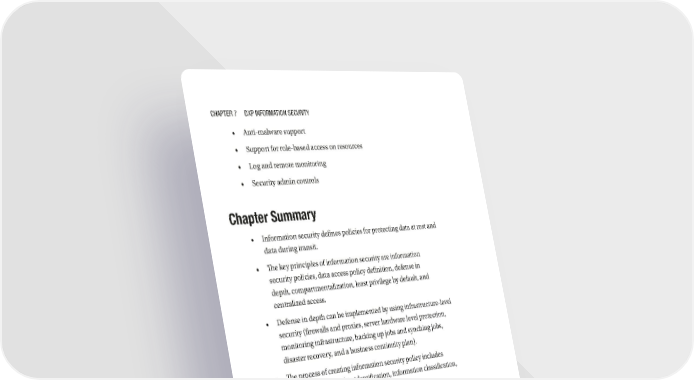 Chapter 7 DXp InformatIon SeCurIty • Anti-malware support • Support for role-based access on resources • Log and remote monitoring • Security admin controls Chapter Summary • Information security defines policies for protecting data at rest and data during transit. • The key principles of information security are information security policies, data access policy definition, defense in depth, compartmentalization, least privilege by default, and centralized access. • Defense in depth can be implemented by using infrastructure-level security (firewalls and proxies, server hardware level protection, monitoring infrastructure, backing up jobs and synching jobs, disaster recovery, and a business continuity plan). • The process of creating information security policy includes information ownership identification, information classification, and information security policy definition. 212