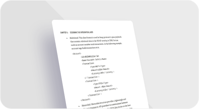 Chapter 5 Designing the integration Layer • Relational: This data format is used in Soap protocol to pass payloads that contain relational data in the SOAP envelop in XML format, such as account number and transactions. In the following example, account tags hold transactions in it. ABCBANK1234 Sourabhh Sethii NEFT 1250 INR RTGS 850 USD • Hierarchal: Hierarchal structure provides a lightweight and efficient structure to API providers to communicate between different systems, of which Restful-JSON data hooks are the best example, which helps us to quickly create and solve complex data transformation issues. { "account": "ABCBANK1234", "transaction": [{ "Type": "NEFT", "Amount": "1250", "Currency": "INR" }, 154