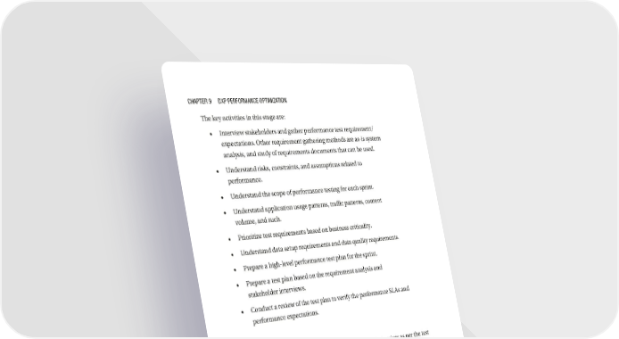 CHAPTeR 9 DXP PeRfORMANCe OPTIMIzATION The key activities in this stage are: • Interview stakeholders and gather performance test requirement/ expectations. Other requirement gathering methods are as-is system analysis, and study of requirements documents that can be used. • Understand risks, constraints, and assumptions related to performance. • Understand the scope of performance testing for each sprint. • Understand application usage patterns, traffic patterns, content volume, and such. • Prioritize test requirements based on business criticality. • Understand data setup requirements and data quality requirements. • Prepare a high-level performance test plan for the sprint. • Prepare a test plan based on the requirement analysis and stakeholder interviews. • Conduct a review of the test plan to verify the performance SLAs and performance expectations. Design During this phase we design and develop the performance test scripts as per the test plan prepared in sprint 0. The performance test scripts can be categorized as client-side performance test scripts and server-side performance test scripts. The main object of performance testing in this stage is to create the test scripts to provide coverage, and execute the performance test scripts. The key activities in this stage are as follows: • Set up the test environment and set up test data. • Create performance test scripts as per the test plan. • Set up a continuous and iterative testing environment. • Set up a test reporting and notification infrastructure. • Set up parameters to be monitored at the infrastructure resource level. 240