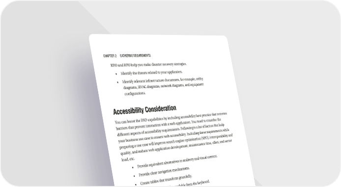 Chapter 2 GatherinG requirements RTO and RPO help you make disaster recovery strategies. • Identify the threats related to your application. • Identify relevant infrastructure documents, for example, utility diagrams, HVAC diagrams, network diagrams, and equipment configurations. Accessibility Consideration You can boost the DXP capabilities by including accessibility best practice that removes barriers that prevent interaction with a web application. You need to consider the different aspects of accessibility requirements. Following is a list of factors that help your business use case to ensure web accessibility. Including these requirements while preparing a use case will improve search engine optimization (SEO), interoperability and quality, and reduce web application development, maintenance time, effort, and server load, etc. • Provide equivalent alternatives to auditory and visual content. • Provide clear navigation mechanisms. • Create tables that transform gracefully. • All functionality will be available from the keyboard. • Text content will be readable and understandable. • Provide enough time for the user to read. • Content must be robust enough, as it will be accessed and interpreted by a wide variety of devices and technology. You must check and consider the aforementioned points before developing an application, or else it will be difficult for one or more than one group to access the web content. 58