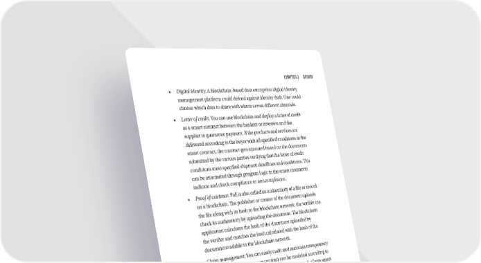 Chapter 3 Design • Digital identity: A blockchain-based data encryption digital identity management platform could defend against identity theft. One could choose which data to share with whom across different channels. • Letter of credit: You can use blockchain and deploy a letter of credit as a smart contract between the bankers or investors and the supplier to guarantee payment. If the products and services are delivered according to the buyer with all specified conditions in the smart contract, the contract gets executed based on the documents submitted by the various parties verifying that the letter of credit conditions meet specified shipment deadlines and conditions. This can be automated through program logic in the smart contract to indicate and check compliance or noncompliance. • Proof of existence: PoE is also called an authenticity of a file or record on a blockchain. The publisher or creator of the document uploads the file along with its hash to the blockchain network; the verifier can check its authenticity by uploading the document. The blockchain application calculates the hash of the document uploaded by the verifier and matches the hash calculated with the hash of the document available in the blockchain network. • Claim management: You can easily audit and maintain transparency while making claims. A smart contract can be modeled according to claim process and deployed on the blockchain network. Claim smart contracts automatically and securely complete all the steps involved from automating coverage verification to claims validation. • Loyalty and rewards: A blockchain-based loyalty and rewards platform provides and maintains transparency among stake holders. Multiple reward programs and cards are merged in one platform and then rewards can be used anywhere without any restrictions. 101