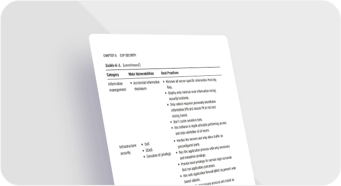 Chapter 6 DXp SeCurity Table 6-1. (continued) Category Main Vulnerabilities Best Practices information • accidental information • remove all server-specific information from log management disclosure files. • Display only minimal error information during security incidents. • Only collect required personally identifiable information (pii) and secure pii at rest and during transit. • Don’t cache sensitive data. • use defense in depth principle performing access and data validation at all layers. infrastructure • DoS • harden the servers and only allow traffic on security • DDoS preconfigured ports. • elevation of privilege • run the application process with only necessary and nonadmin privilege. • provide least privilege for service login accounts that run application processes. • use web application firewall (WaF) to prevent web- based attacks. • Disable all unnecessary services and install an antivirus scanner on server machines. • use load balancer and/or cloud security to handle the surge in traffic. • Filter packets at the firewall to prevent DoS/DDoS attacks. Security Testing Framework for DXP Security test planning for DXP should be done iteratively in all phases. For comprehensive security we should continuously monitor the application security events in real time and take corrective actions during security incidents. The key steps of a DXP security testing framework are given in Figure 6-3. 192