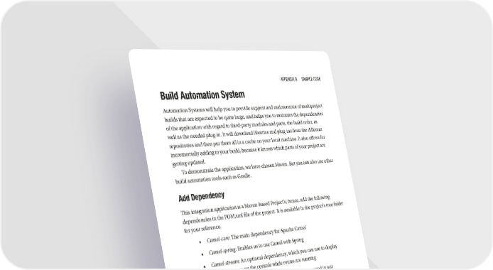 Appendix B SAmple Code Build Automation System Automation Systems will help you to provide support and maintenance of multiproject builds that are expected to be quite huge, and helps you to maintain the dependencies of the application with regard to third-party modules and parts, the build order, as well as the needed plug-in. It will download libraries and plug-ins from the different repositories and then put them all in a cache on your local machine. It also allows for incrementally adding to your build, because it knows which parts of your project are getting updated. To demonstrate the application, we have chosen Maven. But you can also use other build automation tools such as Gradle. Add Dependency This integration application is a Maven-based Project’s; hence, add the following dependencies in the POM.xml file of the project. It is available in the project’s root folder for your reference. • Camel-core: The main dependency for Apache Camel • Camel-spring: Enables us to use Camel with Spring • Camel-stream: An optional dependency, which you can use to display some messages on the console while routes are running • Spring-context: The standard spring dependency, required in our case as we are going to run Camel routes in a Spring context (Spring container) • Spring-core: The main dependency of Spring • log4j: Log4j is a Java-based logging utility that enables us to implement logging in our application. • Jetty: The Jetty plug-in is used to as a lightweight server to instantly run the application and test the development work. 347