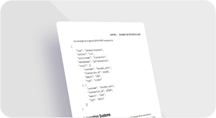 Chapter 5 Designing the integration Layer An example of a typical JSON-WSP response is: { "type": "jsonwsp/response", "version": "1.0", "servicename": "Transaction", "methodname": "getTransaction", "result": [{ "username": "Sourabh_sethi", "transaction_id": 123456, "amount": "200", "type": "credit" }, { "username": "Sourabh_sethi", "transaction_id": 123457, "amount": "1200", "type": "debit" }] } Integration Systems Integration systems consist of messages and their transformation from one form to another. We look into messaging systems, their construction, and transformation in this section. Messaging Systems A messaging system defines the message format and its transformation capabilities, where messaging channels are defined as per the service that contains the exchange in a piece of information. Pipe, filter, and routers perform the complex processing on a message or exchange (also called a piece of information), whereas filtered and processed data is passed to other messaging system with the help of routers. Messaging endpoints are the connections to a messaging channel to send and receive messages. 161